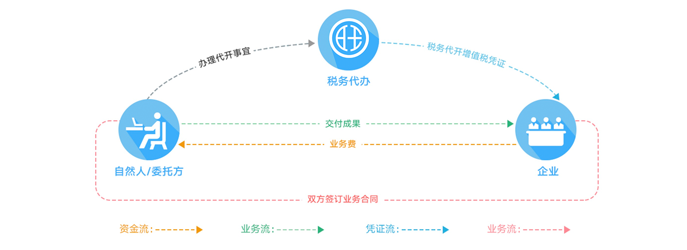 自然人线下与企业完成业务流程 联系薪旺通服务专员提交代办资料 薪旺通安排人员前往税务大厅办理 薪旺通办理完成后提供个税的完税证明、邮寄增值税发票